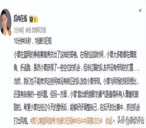 北京时间10月10日,NBA中国赛,篮网加时127-132不敌太阳。 中国球员曾凡博代表篮网出战10分06秒,未能获得出手机会,没有得分进账,贡献1抢断。 赛后,曾凡博10分钟未能获得出手机会引发外界的热议。 知名媒体人杨毅表示:不光是小曾这边,从整个比赛来看是残酷的,篮网这边是什么样的层次和水平,但是威尔逊上赛季打得这么好,蒂米等都没有保障合同,大家都没有端稳这个饭碗。 全世界最为顶尖的运动员都想要迈上这个舞台,把NBA残酷性体现出来。 全NBA只有450个名额,只有全世界最优秀的顶级运动员才能踏上这个舞台,一场比赛能打10分钟左右,我们确实要承认小曾攻守两端有差距。 小曾上场就可以看到非常急切,上去就2犯规,比赛能站上舞台,已经是成长,三年前他还是一个高中生,没有拿到任何合同,没有任何一场正规比赛。 这三年不光是北京首钢的绝对主力,包括在国家队也扮演非常重要的角色,三年后,他站在这个舞台打这种比赛,已经体现出成长。 从全场比赛走势而言,曾凡博在场的这段时间大多数都在蹲底角、折返跑,虽然小曾获得了一些空位的机会,但杀红眼的队友并没有传球的打算。 当然,我们也不能苛求这些同样没有转正的队友给小曾传球。小曾与同场的球员相比,还是有自身的一些问题。但另一方面,小曾“踏出舒适圈”的勇气是值得所有人尊重和鼓励的。希望小曾在经过今天的登场后,能够好好调整自己,在后天的比赛中,抓住机会打出风格。 |
