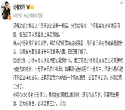 雷速体育10月11日讯 今日NBA季前赛,开拓者124-123国王,此役,杨瀚森砍下16分4篮板3盖帽1助攻,赛后,记者宋翔发文表示,杨瀚森第三节充分展现进攻特点与能力,三分是信心基础。 社媒原文:“记得之前主教练比卢普斯说过这样一段话,分享给各位:‘杨瀚森在进攻端没问题,但在防守以及篮板上需要加强。’自从小杨到开拓者短训营,到之后的正常备战新赛季,开拓者已经对杨瀚森能做什么,在哪些方面能够提升与改善等方面,已经很了解了。” “这场比赛,小杨只是再次证明自己能做什么。第三节是小杨充分展现自己进攻特点与能力的时刻,三分是自己信心基础,如果没有连续两个三分命中,估计小杨后边打不出这样的进攻。这其实留给cba内线一个新的思路:想要走得更远,必须要练三分了。小杨在cba投射三分很少,虽然他在国家队集训时,是有在练习的,但要想去更远、更大的舞台,必须要有三分。” |