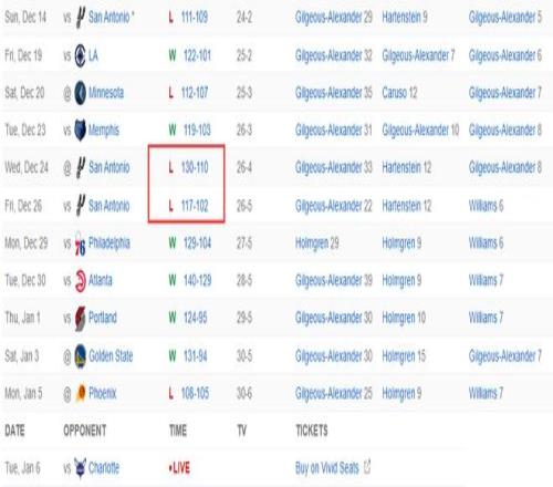 雷霆上一次连败是12月24日、12月26日连败马刺,如今1月5日、1月6日连败太阳、黄蜂,输给黄蜂是最惨的因为黄蜂并不是附加赛圈内的球队。