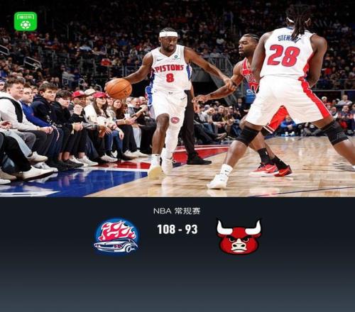 第一节活塞斯图尔特拿下11分,公牛多森姆拿下9分,首节战罢活塞30-24领先公牛 第二节活塞斯图尔特拿下6分,公牛帕特里克-威廉姆斯拿下6分,半场结束活塞52-50领先公牛 第三节活塞斯图尔特拿下8分,公牛布泽利斯拿下8分,第三节结束活塞76-77落后公牛 第四节活塞查兹-拉尼尔拿下8分,公牛武切维奇拿下5分,最终活塞108-93战胜公牛